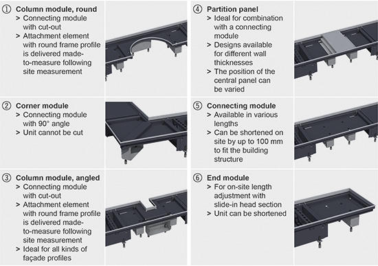 Columns positioned directly in front of glazing do not present a problem for the installation of trench heaters. This is solved either by means of a cover plate fitted on both sides or by cutting a recess for the column in the grille itself.