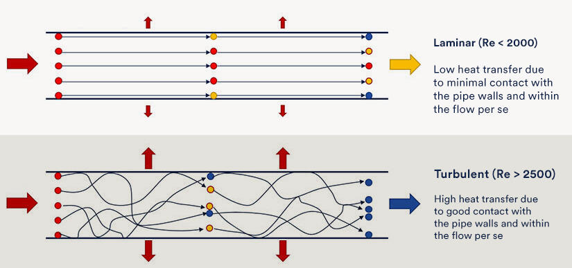 No turbulence is (yet) visible in a laminar flow. The water flows in layers that do not mix with each other. At the same time, a laminar flow through pipework leads to significantly lower output. Some turbulence is actively called for. In turbulence, the water molecules have more contact with the inside wall of the pipe and are able to more easily transmit heat to the heat carrier.