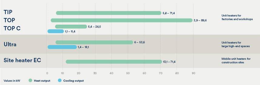 An individually tailored solution can be found for every project to perfectly meet all the project-specific requirements: whether you need heating and/or cooling or wish to install the units in an industrial or commercial space or on a sales floor. After all, the unit heater range with EC technology delivers an exceptionally wide output range.