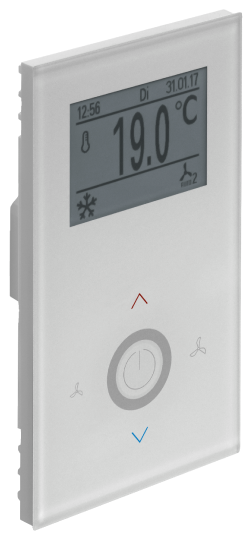 Heating/Cooling, 2- and 4-pipe, 3-stage. Only in conjunction with valves/valve kits with actuator, with OFF/Manual/Automatic fan switchover, 230 V, AC, Open/Closed, Surface-mounted, Protection class II, Protection class IP 30, Temperature setting range 5 - 30 °C, Colour similar to RAL 9010 pure white, Type 30155