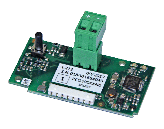 The communication card slots into the free interface on the PCB.