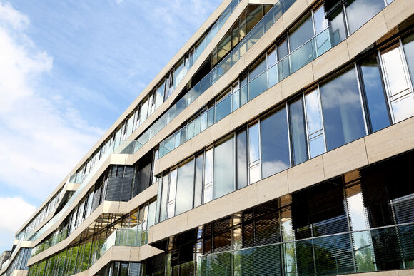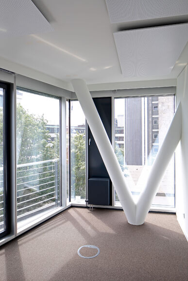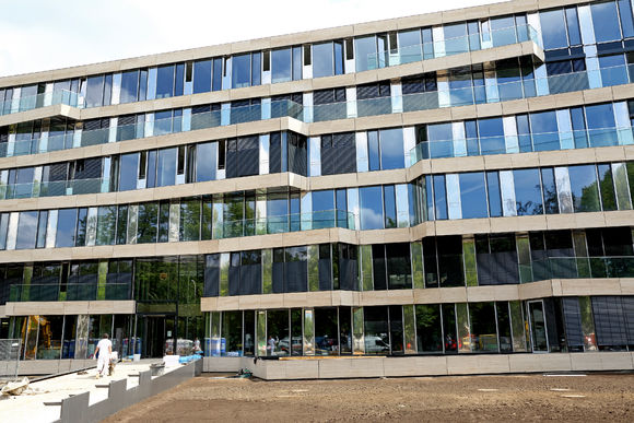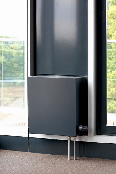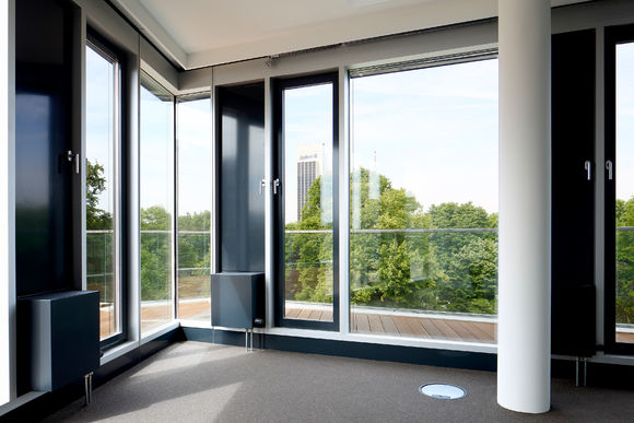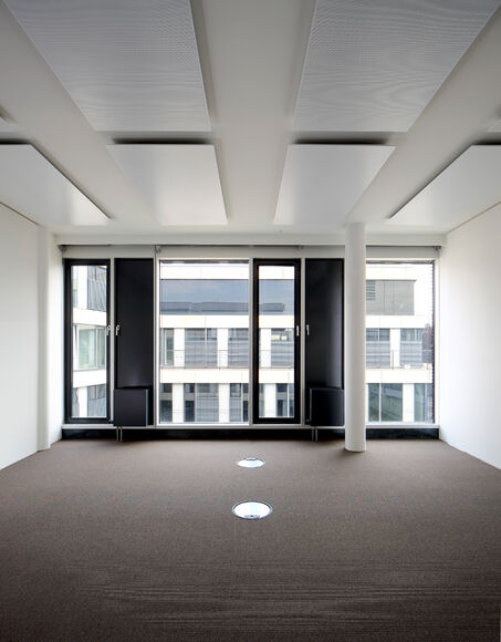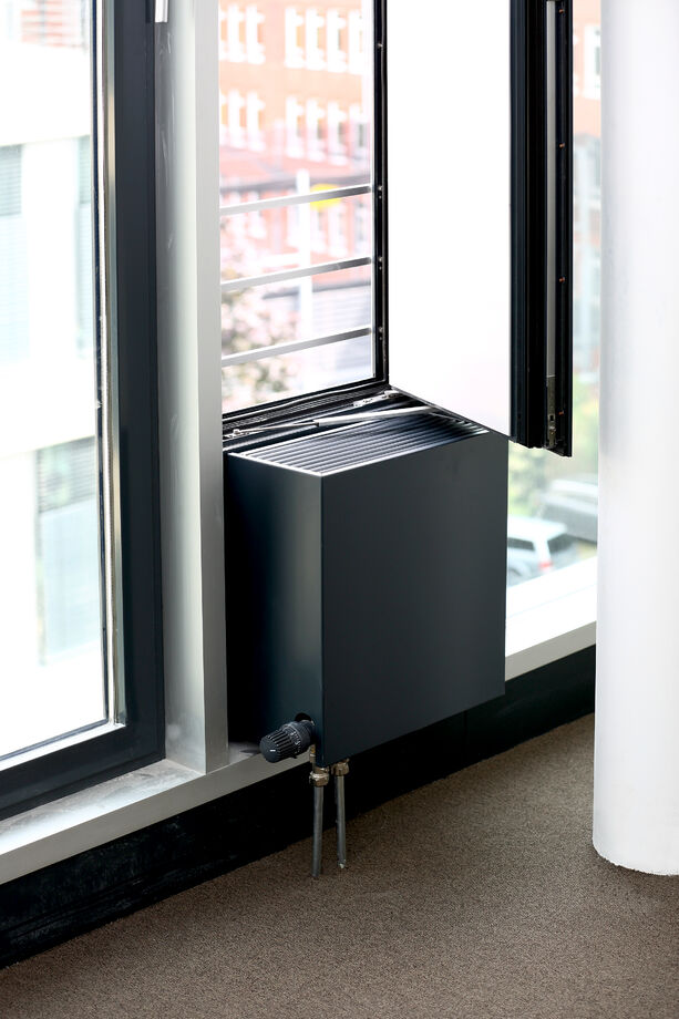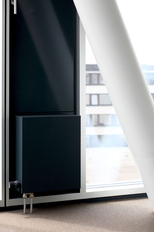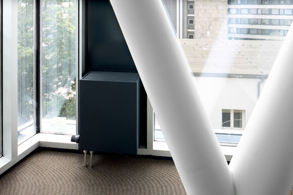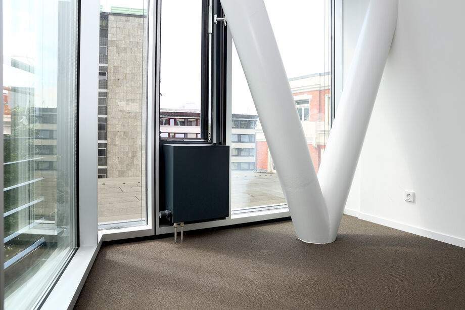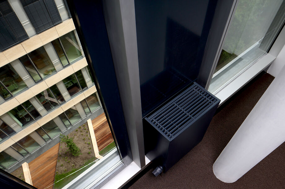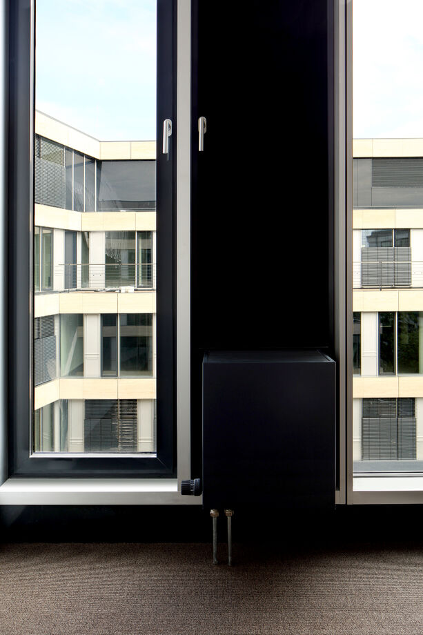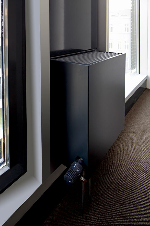 A slim design of PowerKon + W was developed for installation in recesses in this office building with a total of 13,200 m2 of rentable floor space. The flow and return connections from below on a valve assembly represent a further special feature of this unit. Kampmann supplied convector assemblies (valve bodies, return shut-off valves) and thermostatic heads as accessories. Moreover, special wall brackets with precise drill holes were constructed for fixing the units on the façade.