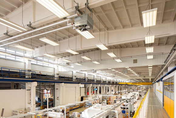 There are nine KaCompact ventilation units on the roof of the new production hall. Together with 45 TOP unit heaters they form the Hybrid ECO system. The central ventilation unit carries on-demand the hygienic volume of fresh air to the unit heaters. The decentralised units in the rooms are responsible for the thermal treatment of the recirculation air and fresh air. This technique means that the air ducts,and the air handling unit, can be designed smaller. This reduces investment costs, ensures cost-effective operation and permits the stand-alone temperature control and ventilation of indoor spaces. Two more freely configured air handling units for the washroom and training areas complement the ventilation management system.