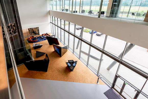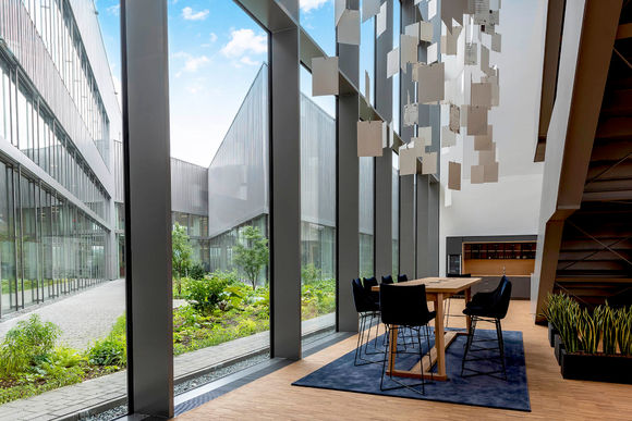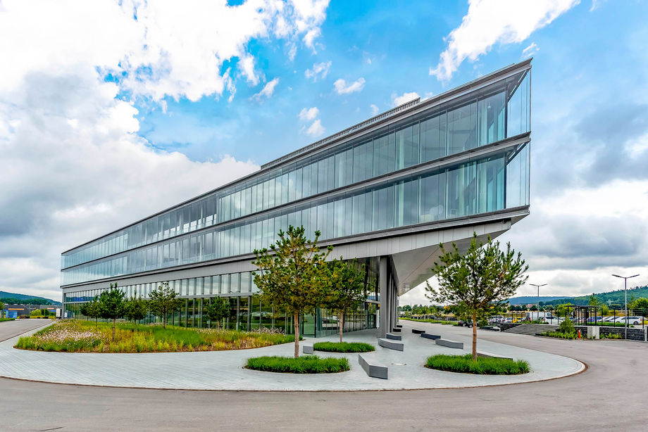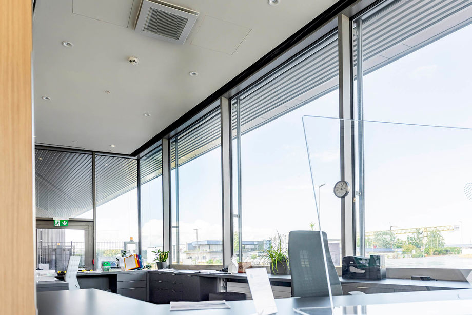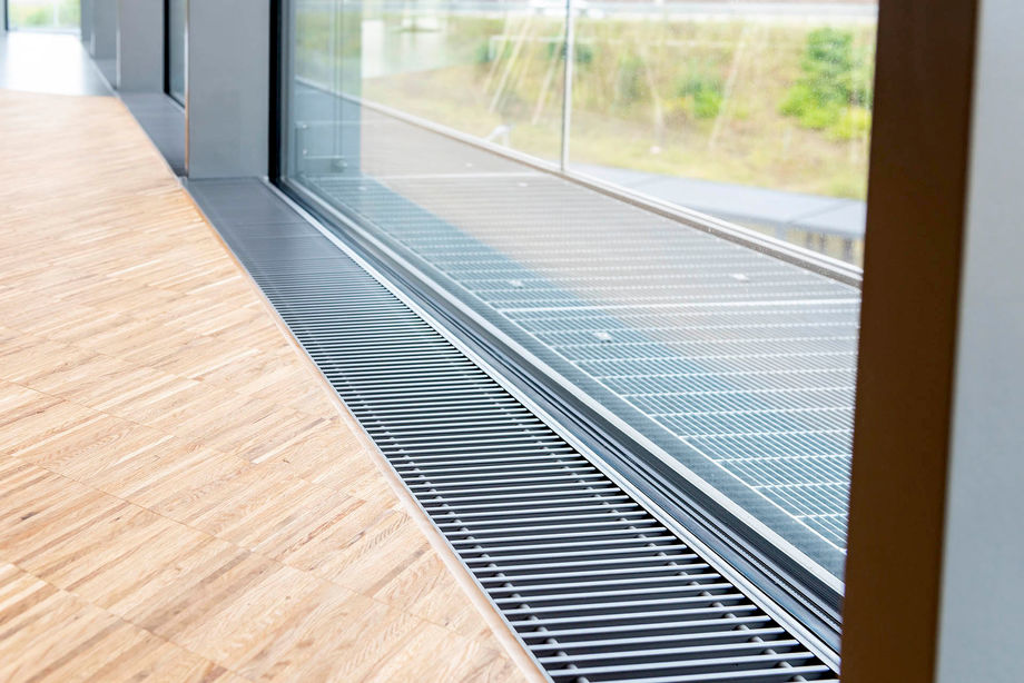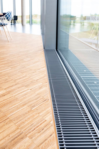 First and foremost, they fitted special width Katherm QK trench heaters. The arrow-shaped, largely glazed administration building is the ideal place of use for the Katherm unit with its whisper-quiet EC tangential fan. The unit can be customised to requirements: mitred corners, curved units, column cut-outs, chamfered ends – all shapes are possible.