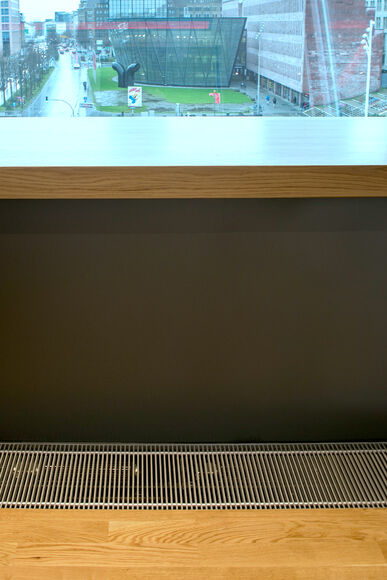 Katherm QK is a veritable Kampmann classic. The underfloor convector heats with whisper-quiet fan assistance and is optimised for low temperature operation. It can be individually adapted: Mitred corners, curved units, column cut-outs, chamfered ends – all shapes are possible. Like all Katherm models, the QK also regularly undergoes ongoing development in the Kampmann Research & Development Centre and thus remains the market-leading unit.