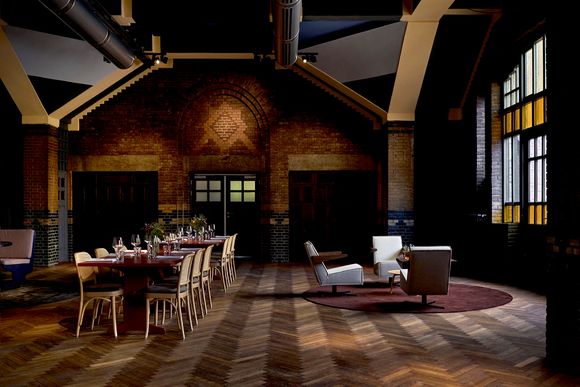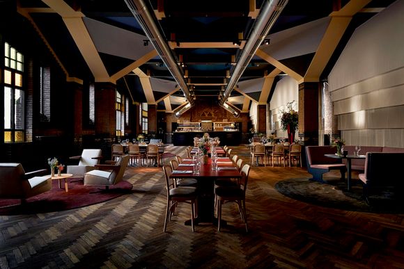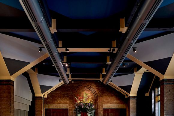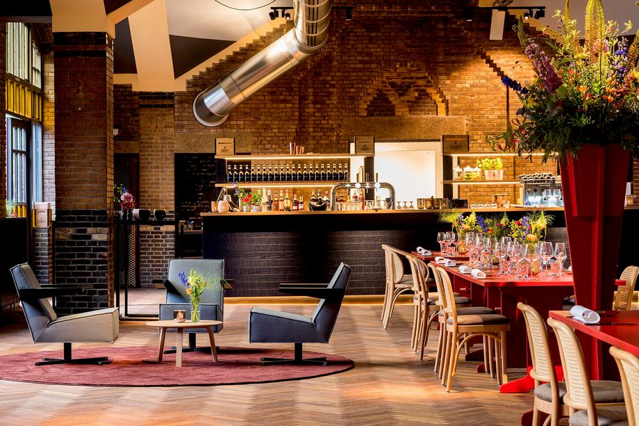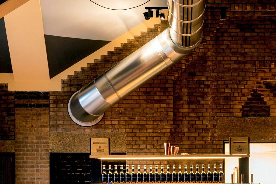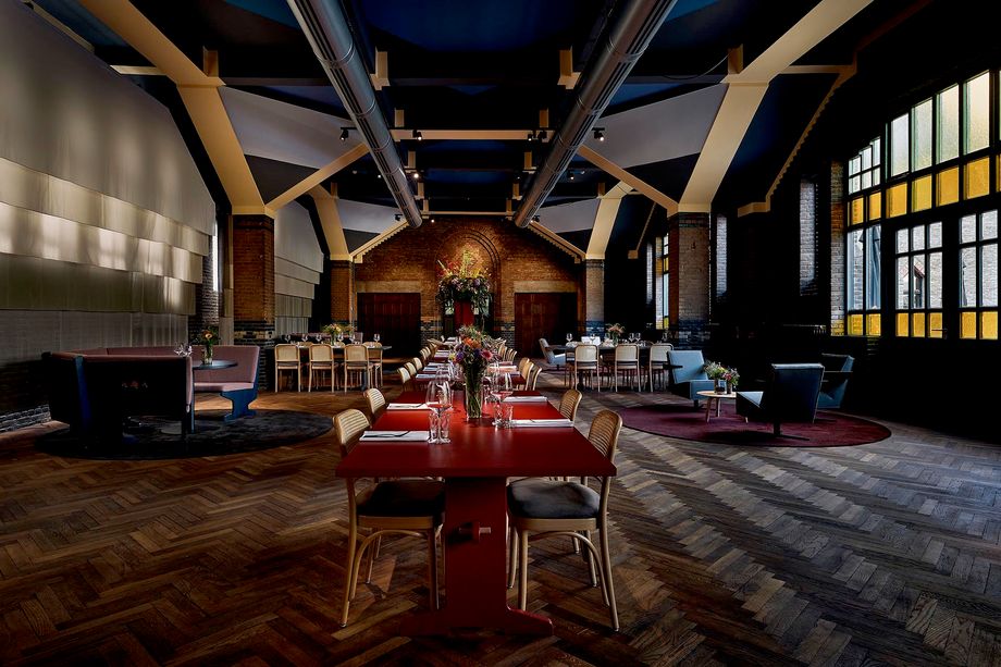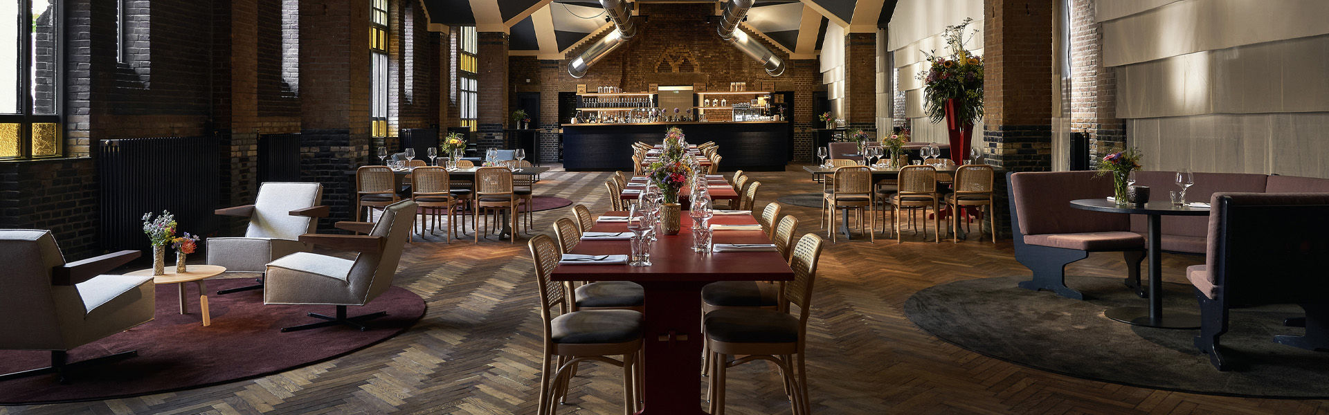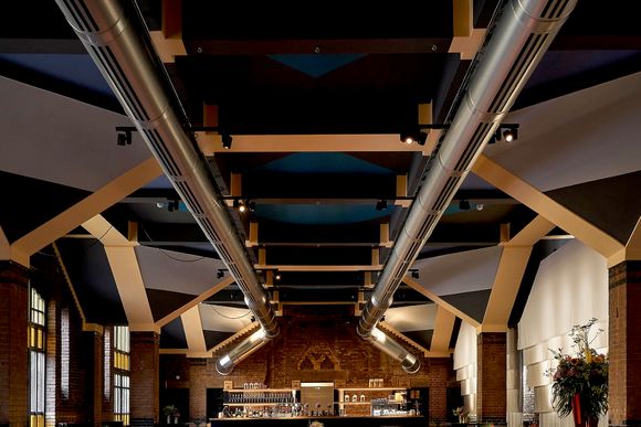 This is also the case in the restaurant De Refter, the name of which relates to the building's monastic past: De Refter is the Dutch name for the dining area of an abbey. And that's exactly what it looks like here today: rough brick walls, colourfully glazed windows, brick arches and herringbone parquet define the look of the spacious high-ceilinged room. Ceilings that are high enough to provide enough space for Kampmann RRA tubular diffusers. Two RRA supply air runs cross the restaurant and counter the historical ambience with their modern, galvanised look. An extremely successful architectural twist.