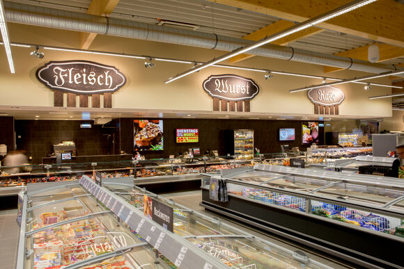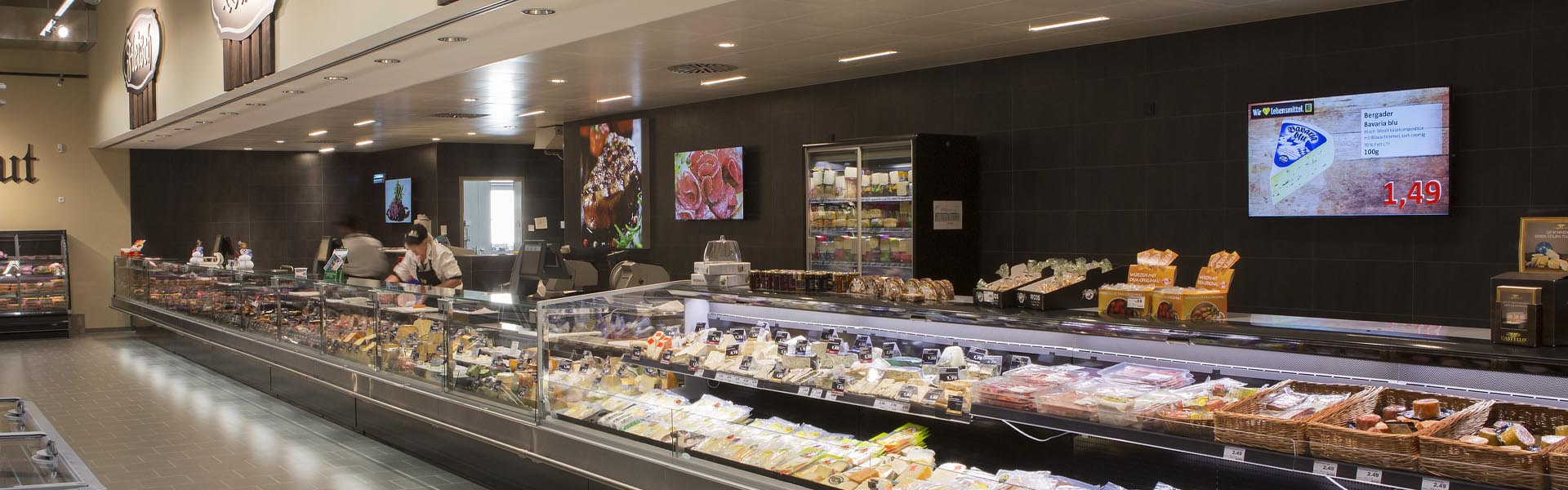 A Kampmann Airblock FG is used for a very special purpose in Haselünne. The slim-line unit for heating, cooling, ventilating and filtering is used in the EDEKA supermarket to provide hygienic screening for the fresh food counter. Air is drawn in behind the counter and discharged with positive pressure through ventilation slots in front of the counter. The comfortable warmth generated by a Tandem door air curtain welcomes customers in at the entrance to the supermarket, where two attractive Ultra unit heaters are also fitted. A TOP unit heater is responsible for efficiently generating heat in the store rooms.