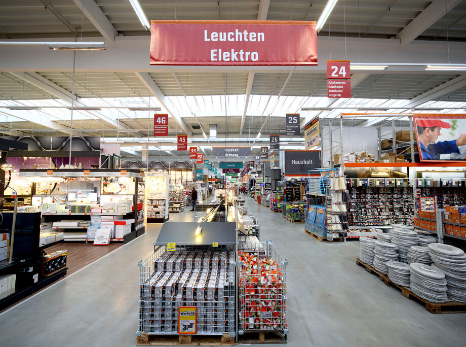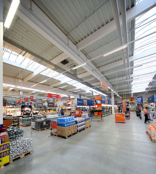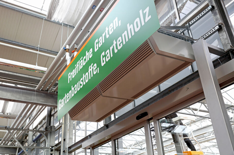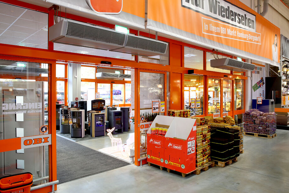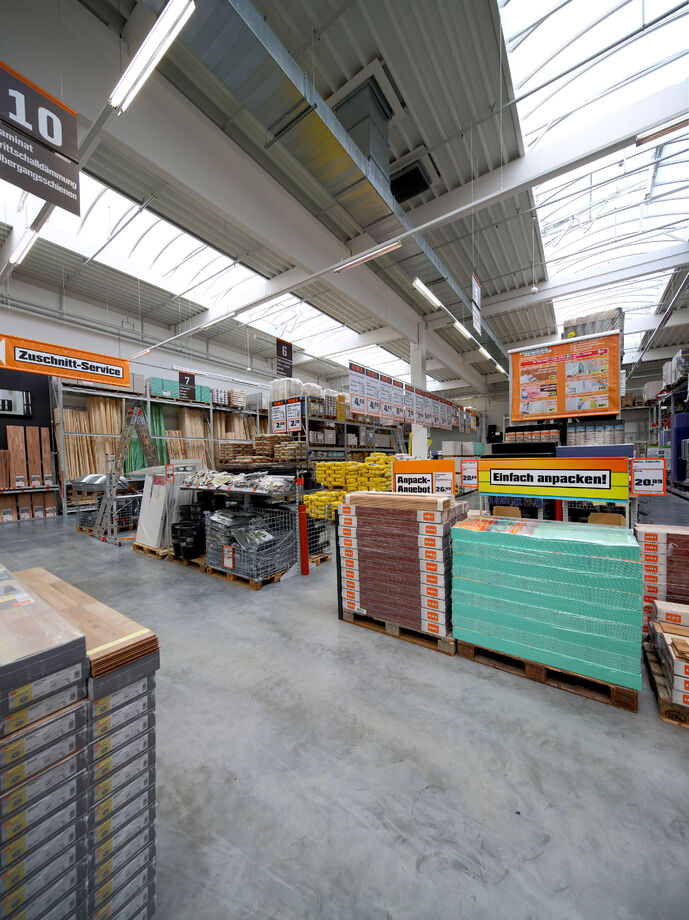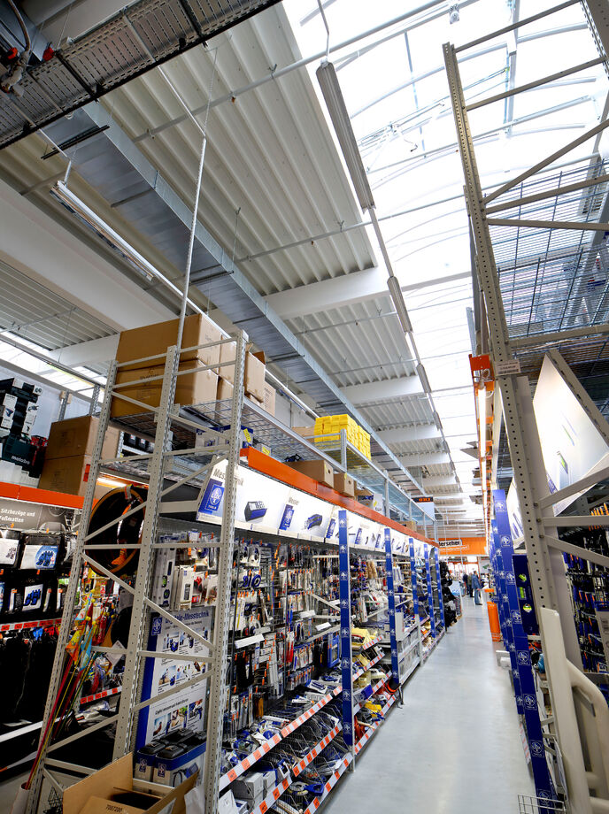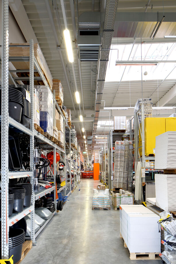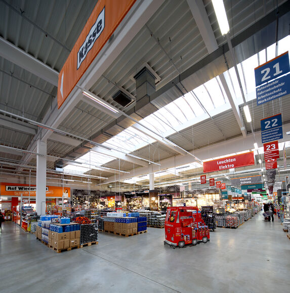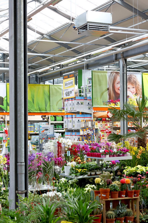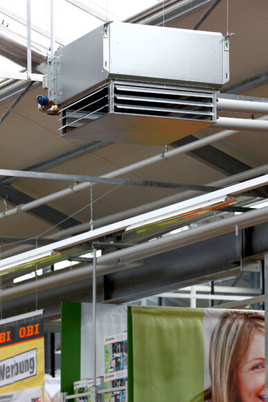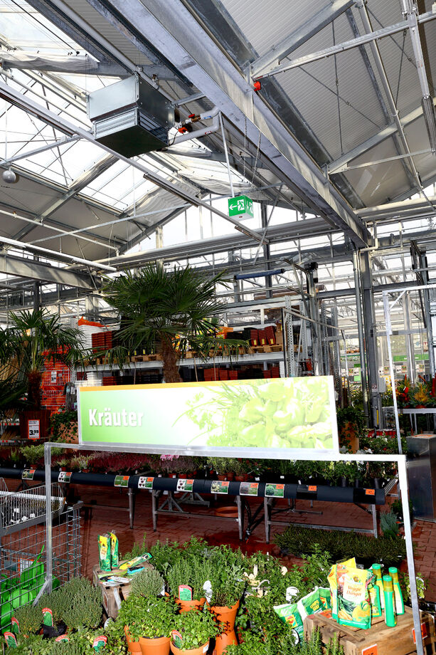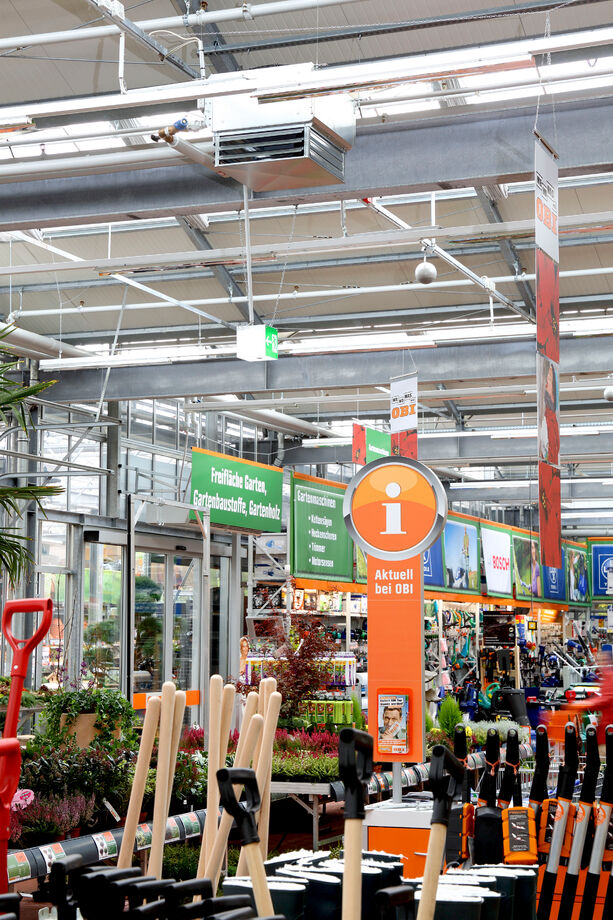 Six ventilation units with a total air volume of 40,000 m³ /h provide central ventilation in the DIY store. The store also has 84% heat recovery due to the efficiency of the double-plate heat exchangers. The central ventilation units are designed by Kampmann GmbH in Lingen and produced by Nova Apparate GmbH in Donaueschingen. The skill in the design of the system is the combination of traditional central ventilation with decentralised unit heaters. The ventilation system is CO2-led, with power consumption being as low as possible, and therefore only as much as is necessary. TOP unit heaters provide decentralised heating in the DIY market and heat the various zones to the required temperature on demand. Thanks to the use of EC motors, power consumption for the 10,000 m² sales floor is reduced to a minimum, in line with the current state-of-the-art.