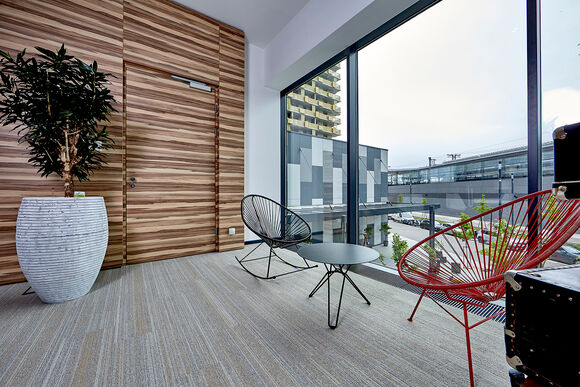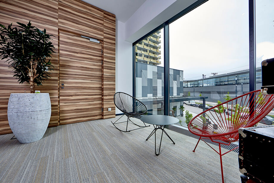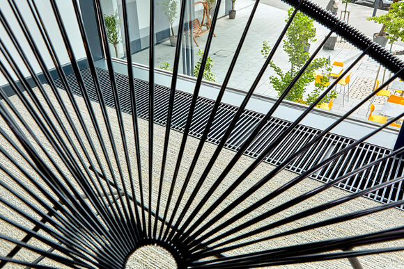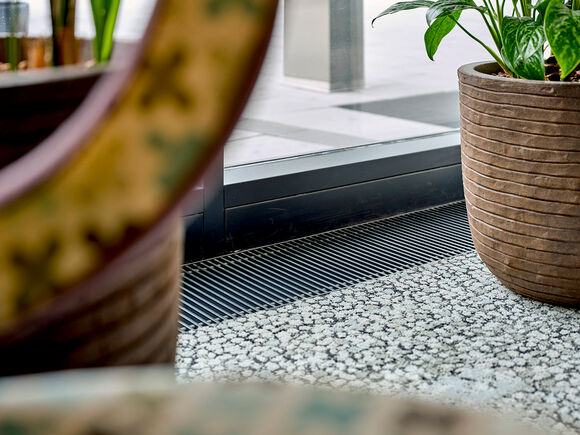 Kampmann trench heaters are located throughout all parts of the buildings. The have a colour-matched powder-coated finish depending on where they are located: sometimes anthracite grey (RAL 7016), sometimes deep black in colour (RAL 9005). Both Katherm NK with natural convection and Katherm QK with fan assistance provide optimum cold air screening in front of the floor-to-ceiling windows.