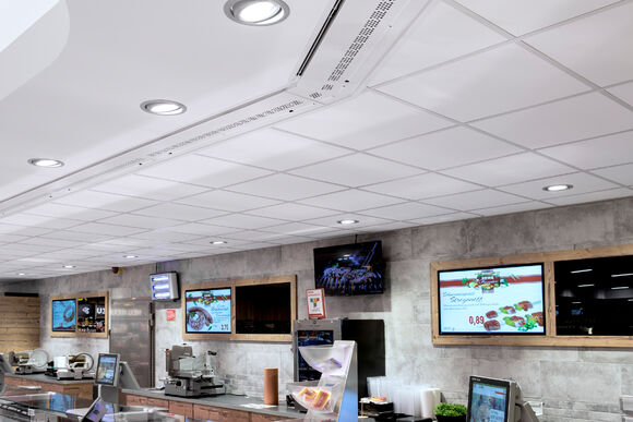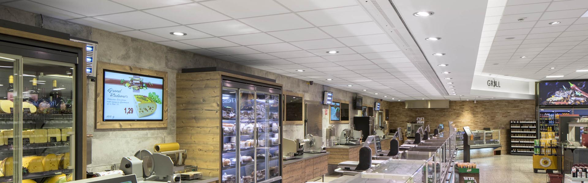 According to DIN 10505, chilled counters need to be shielded in terms of air quality. This is usually done by air being blown downwards towards the sales floor in front of the counter. This process is generally assisted by (swirl) diffusers in the hygiene area behind the counter, which results in positive pressure and, in the event of poor design, also draughts. The KaProtect is a combined slot and positive pressure diffuser, which is discreetly installed above the counter. While the slot diffuser generates the air curtain, the swirl diffuser on the ceiling guides the air towards the rear, as it were ‘flushing’ the hygiene area, eliminating the cause of the draughts.