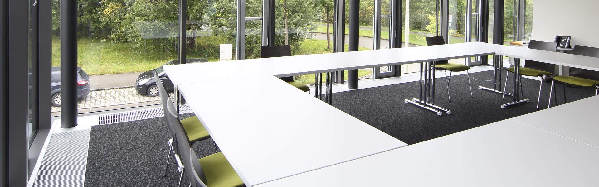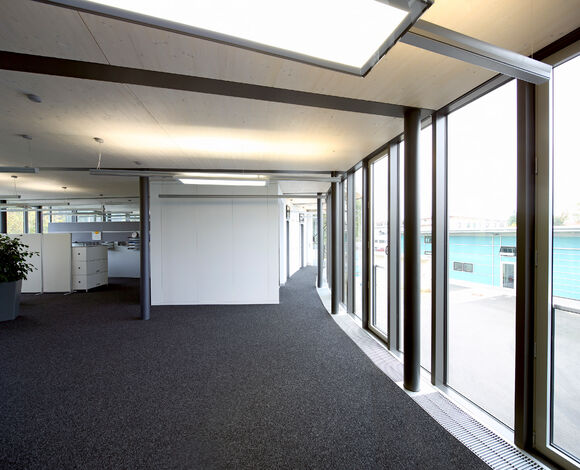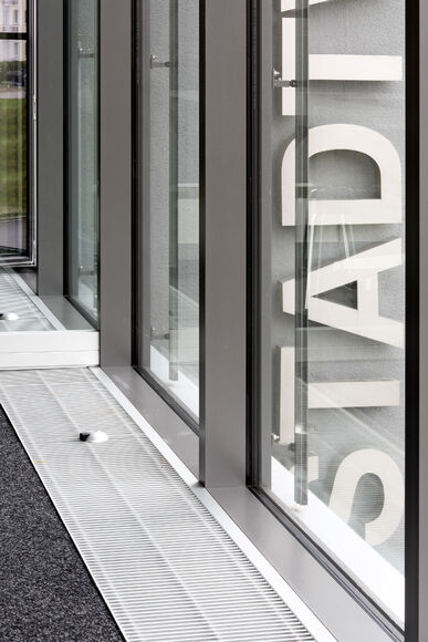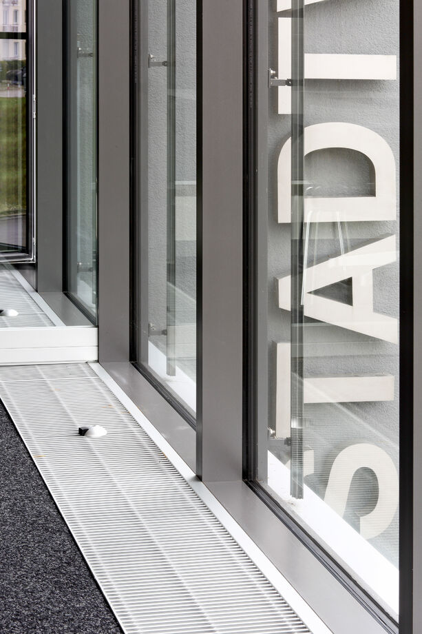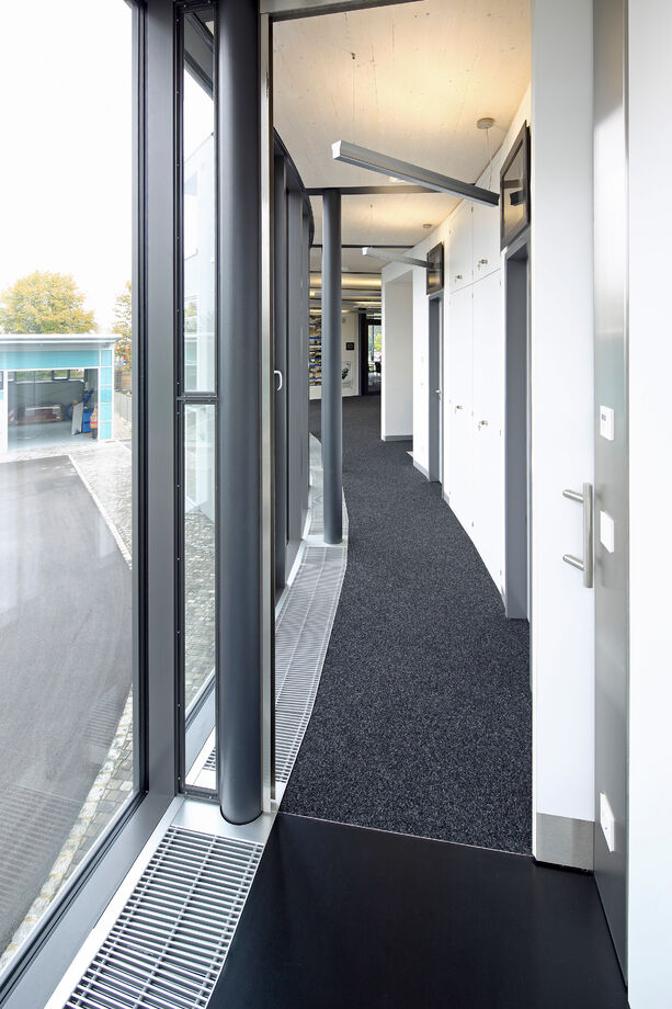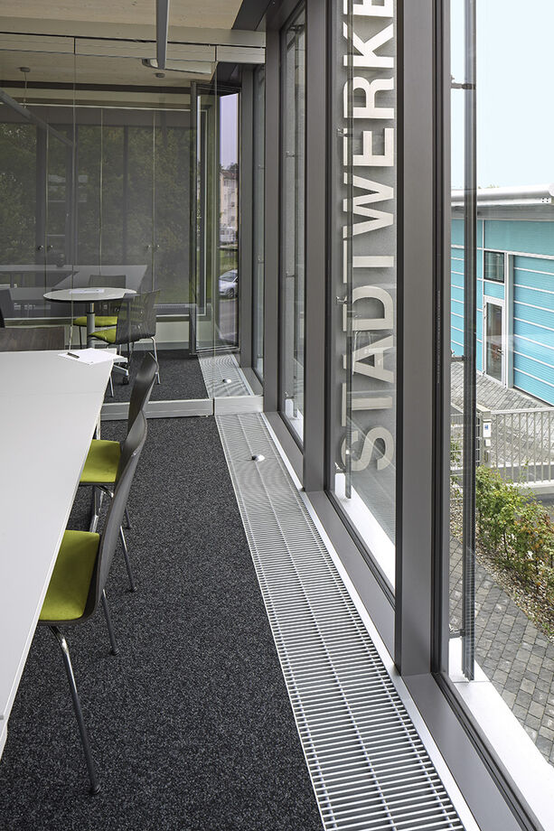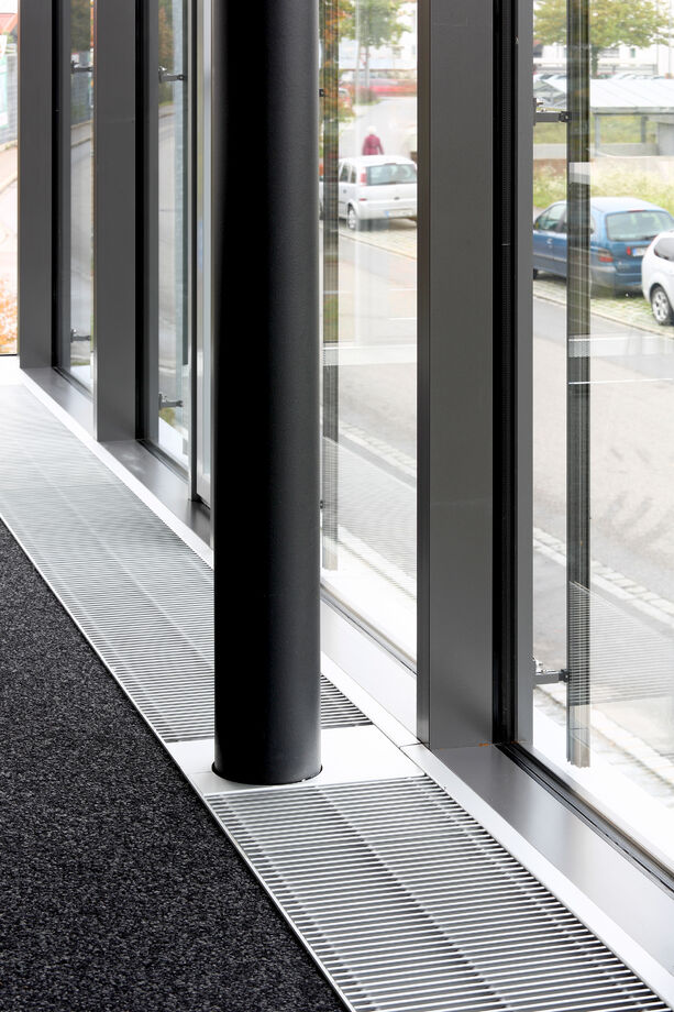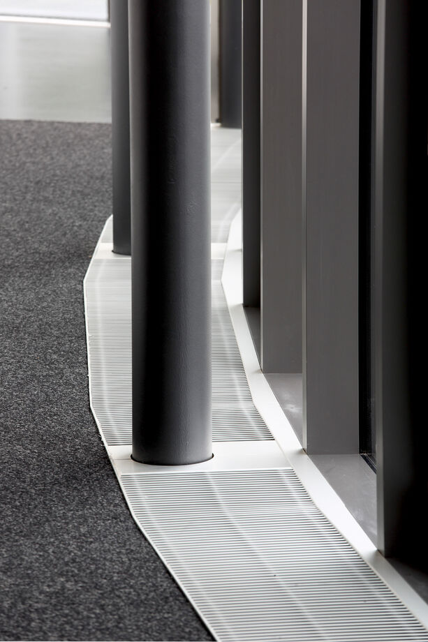 The office building has a post and beam construction with numerous steel beams. The lengths of the trench heaters were therefore adapted to them. The polygonal shape of the façade was also taken into account in the design of the HK and convectors.