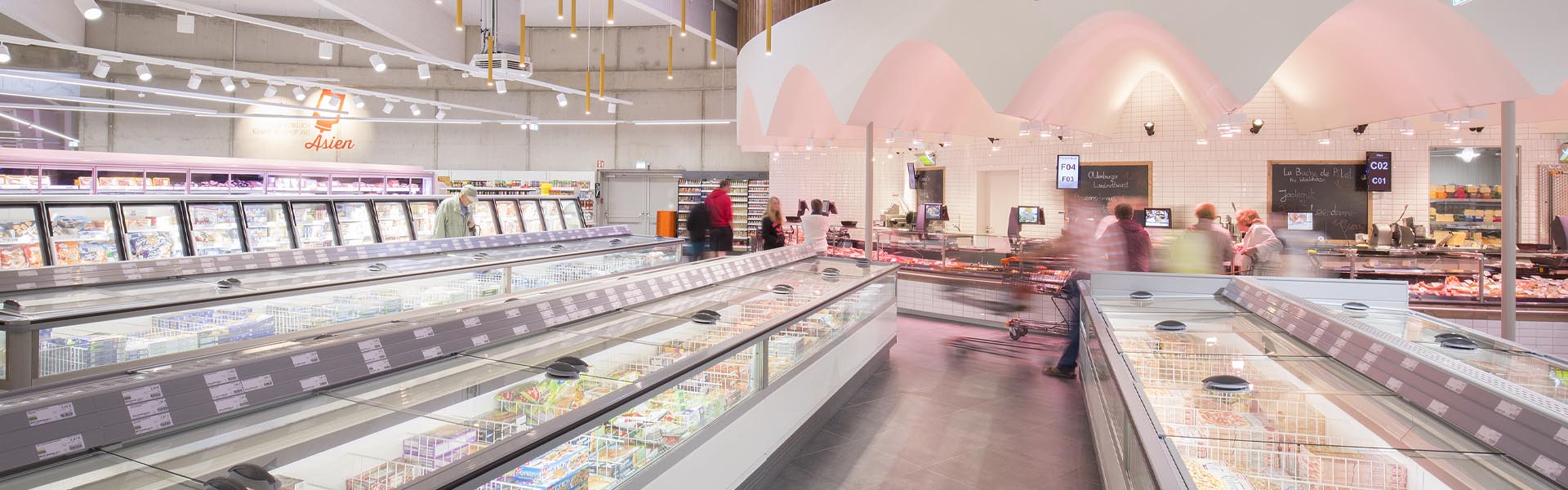 Ultra ceiling-mounted units operate as secondary air units inside the space – truly Kampmann classics units for high-end interiors, which the “aktiv and irma” undoubtedly is. Galaxis radiant ceiling panels complete the concept on the shop floor, while ultra-robust, extremely efficient TOP unit heaters provide service in the stockroom. Finally there are also Diafort roof extract fans, which are responsible for air extraction from the stockroom in the event of a refrigerant alarm on one of the monodirectional ventilation systems.