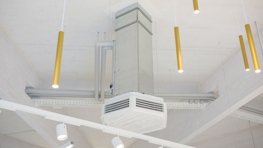 A Kampmann air handling unit is installed on each of the three circles of the building, each of which is precisely tailored to the volume of air to be air conditioned: 4,200 m³/h for zone 1, 8,800 m³/h for zone 2 and 4,900 m³/h for zone 3. The air handling units in zones 1 and 2 form part of the Kampmann Hybrid ECO system, with the air handling units purely providing ventilation and heat recovery. The (optionally preconditioned) air passes along a duct system to the secondary air unit positioned in the room, which takes in the fresh air and finally heats or cools it. This ErP-compliant solution is not just extremely efficient, as the air handling unit only runs when there is a demand for fresh air, saving space and thus also construction costs.