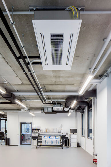 Diverse companies operate out of the new building on the Gartenstrasse: a psychotherapy practice, a tax adviser and an advertising technology producer. In the latter company, the client opted to forego a suspended ceiling to create an industrial chic interior design where the KaDeck operates without a casing and is nevertheless stylish. In other office areas, the KaDeck blends unobtrusively into the grid dimensions of the suspended ceiling.